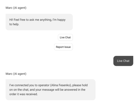 Our team's chatbot clearly understands when a customer wants to talk to a real operator. In this instance, the AI chatbot will quickly assign the responsible manager to chat and send an instant notification to your team.