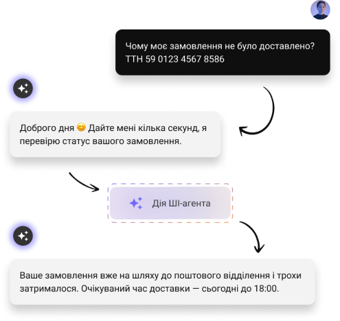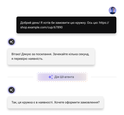 Чат-бот Intelswift працює на базі ШІ-агентів. Це означає, що всередині діалогового вікна — не просто лінійний бот, а ШІ-агент, який відповідає майже як людина, веде діалог, приймає рішення. А ще — може виконати дії, наприклад: піти на ваш ресурс та дізнатися про наявність товару, забронювати столик (coming soon), або передати запит на людину.