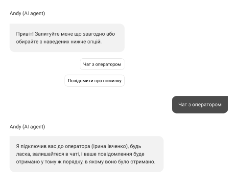 Чат-бот від нашої команди чітко розуміє момент, коли клієнт хоче поспілкуватися з реальним оператором. В такому випадку ШІ чат-бот прикріпить відповідального вільного менеджера та надішле миттєве сповіщення вашій команді.