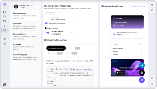 Створюйте чат, наповнюйте його статтями з бази знань та легко додавайте на сайт. Код згенерується сам. Вам потрібно буде лише додати його в код сайту.